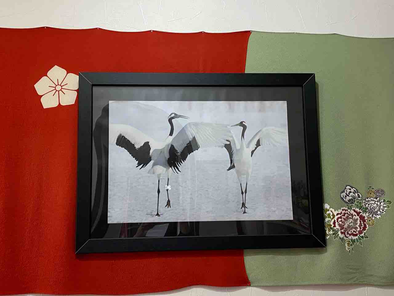 壁紙が白で鶴も白…額縁は黒…あまりに寂しいので風呂敷を壁に貼り付け写真を飾りました✨