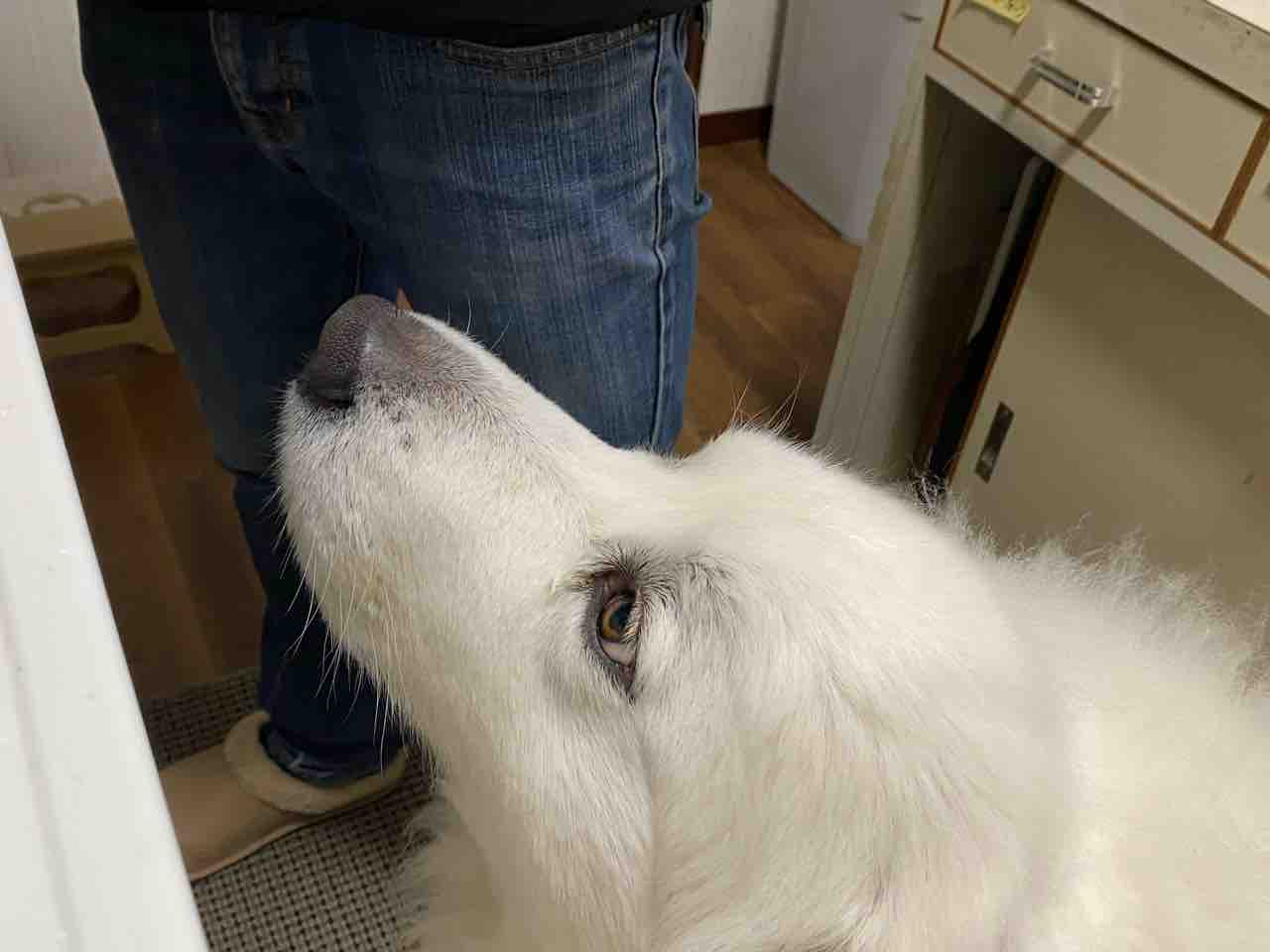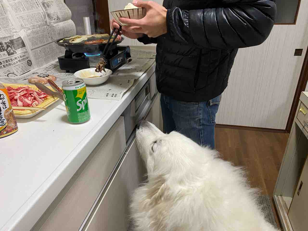 「1人焼肉」を楽しむ息子2号にたかるジニー💗 2023年01月24日 息子2号が焼肉食べたい🥩と言うので、リビングでジュージューしたら臭いが2.3日取れないので、我が家はキッチン換気扇下で「一人焼肉」をします。それも立ち食い(笑)男子は食べるの早いのでこれで充分です😂食べ物だと察すると、絶対にやってくるジニー💗目も振れず、箸先一点見つめてスタンバイ❗️