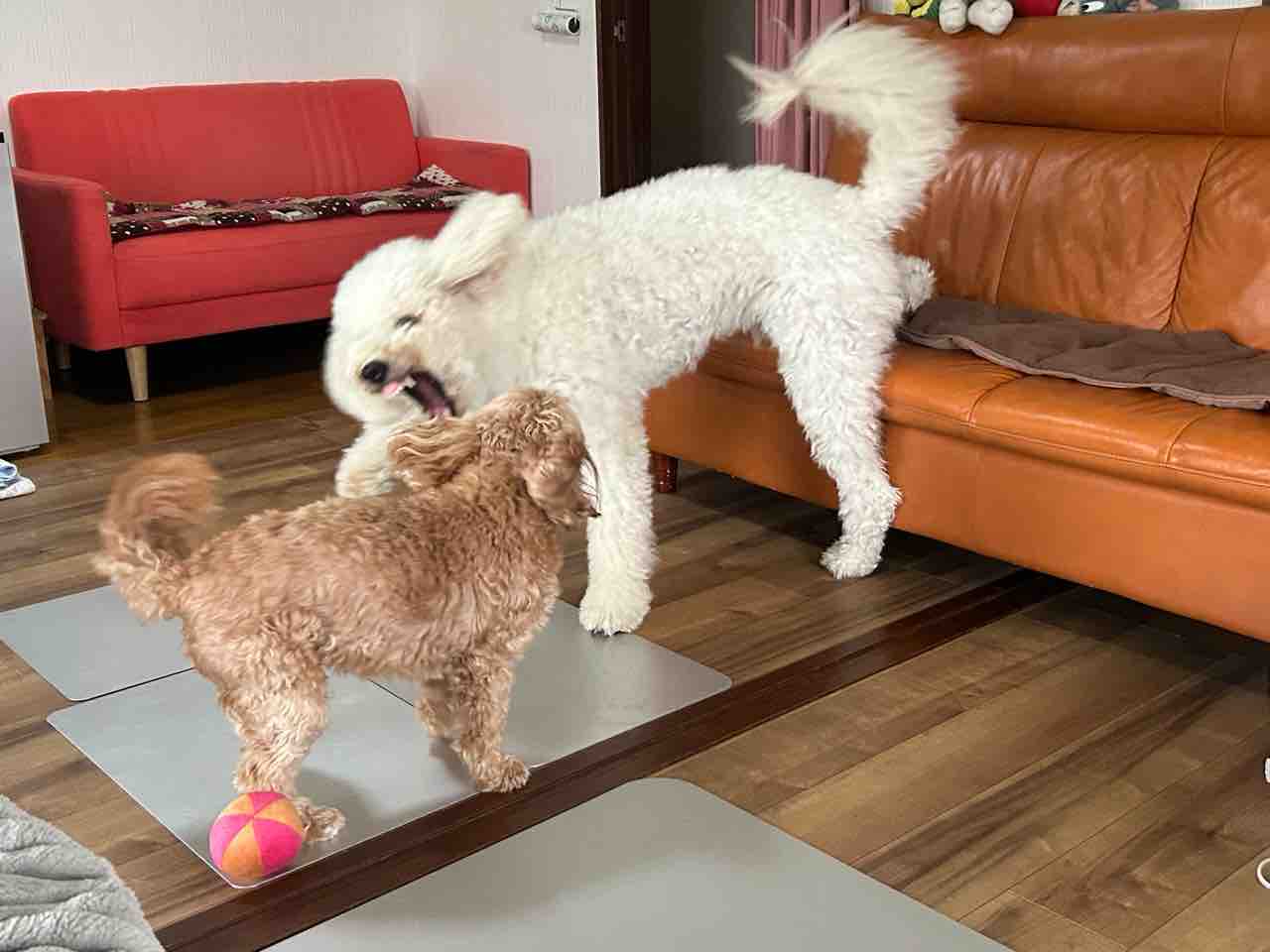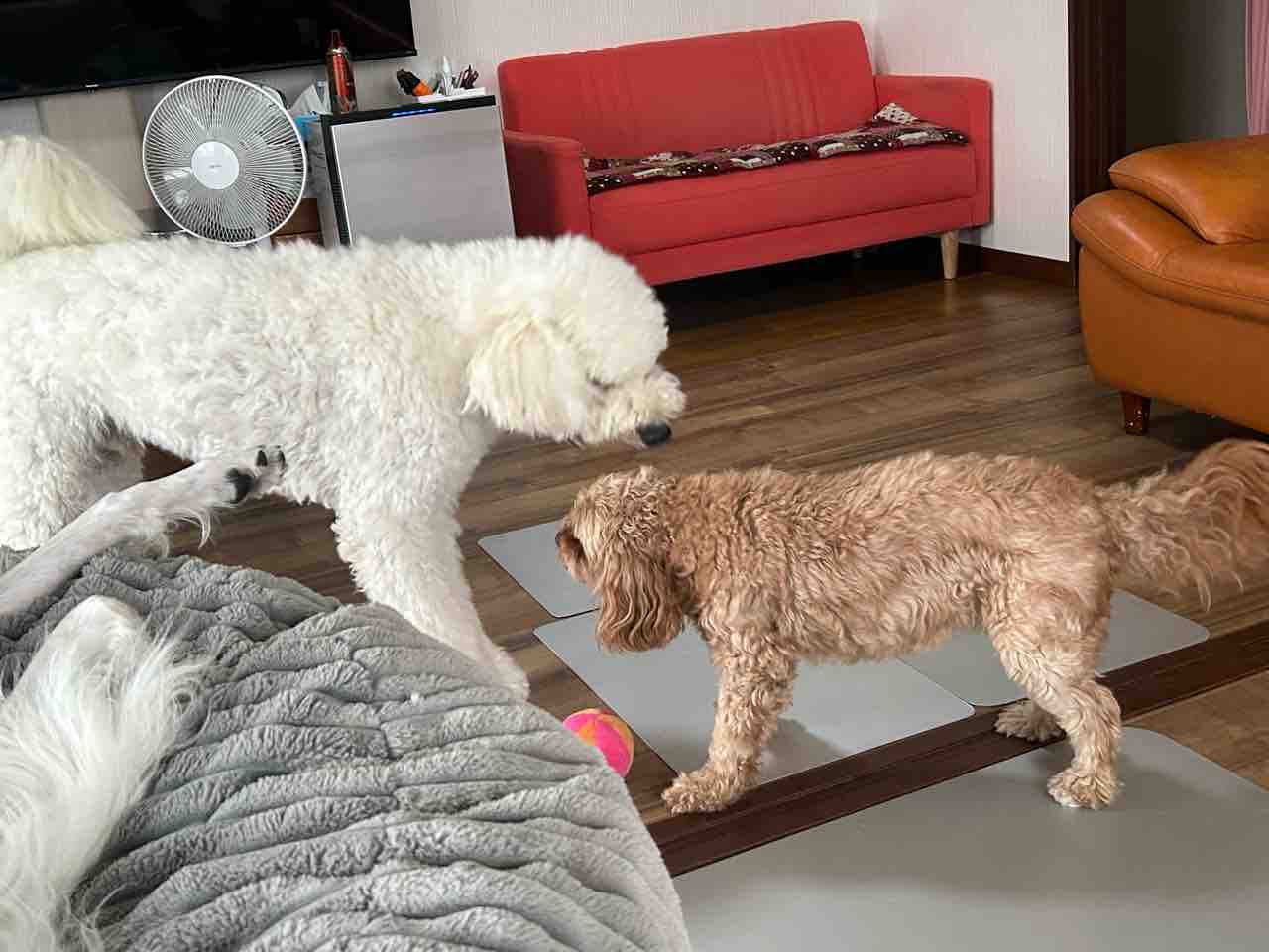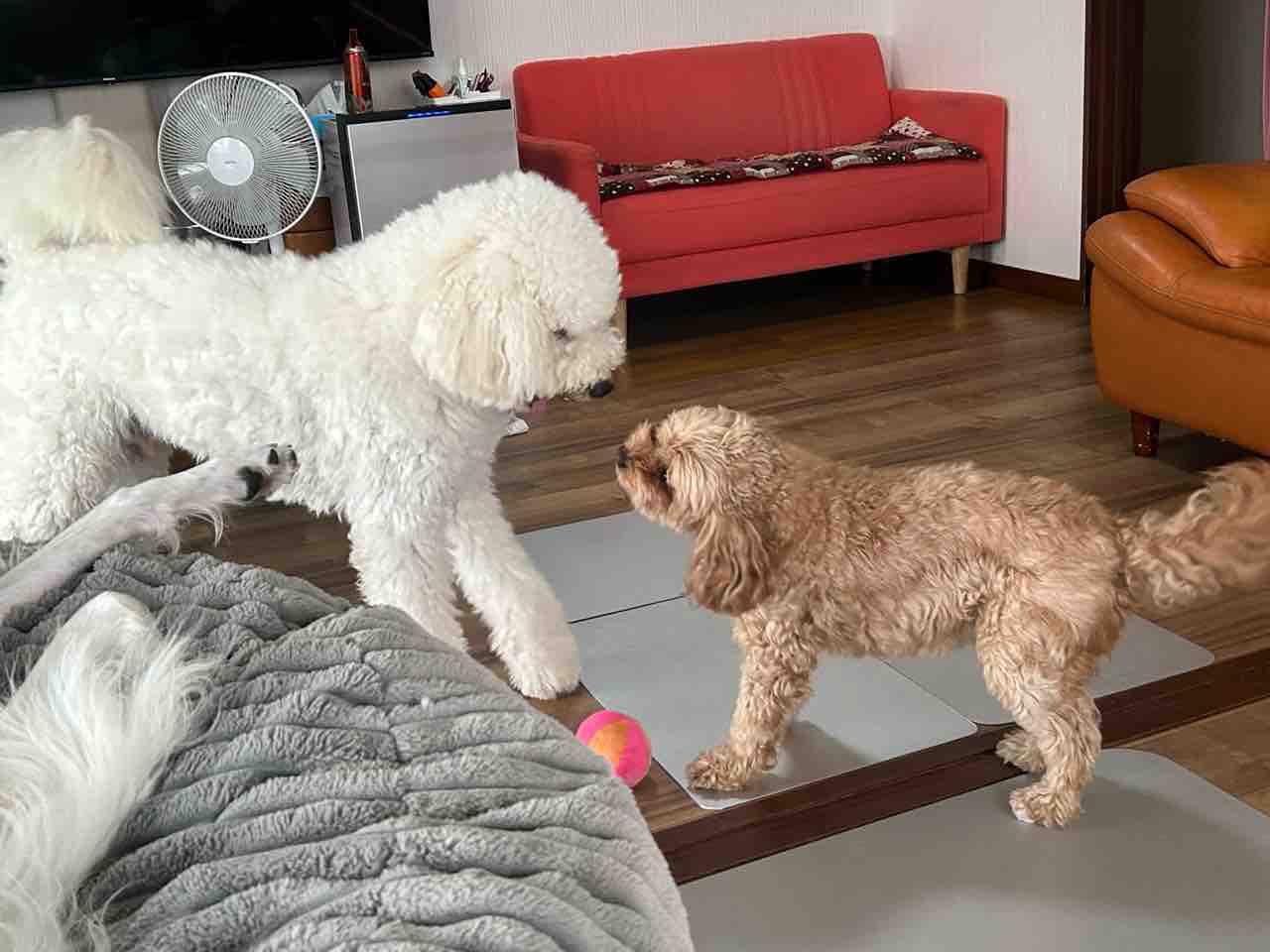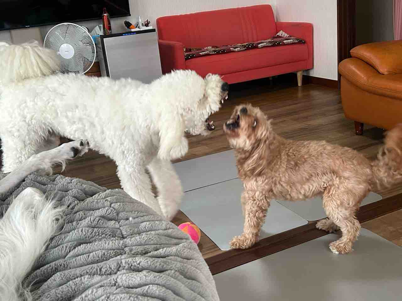 フローラの性格上、売られた喧嘩は買うタイプなのでしばらくはガウガウ💥うるさい犬部屋でした🐶