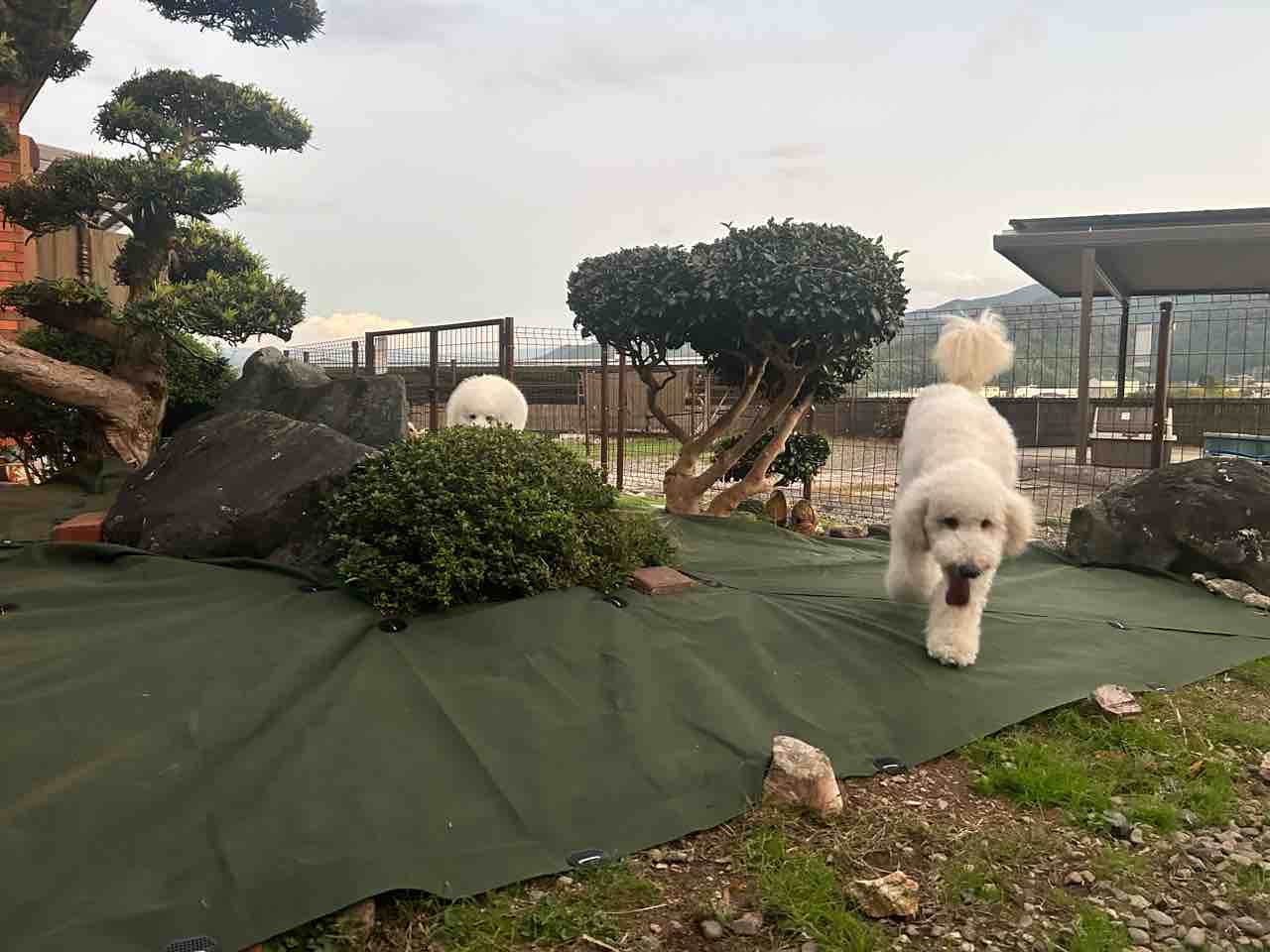 防草シート張り替え終了👍 2024年11月07日 庭木のある場所の防草シートを張り替えましたー✨ 以前は4年前❓まだこんなグリーン色のシートはなく、畑によく敷いてある黒いマルチでした。今のは不織布みたいな生地で、柔らかく見た目も綺麗です。10mのを買い、試行錯誤で全体的にほぼ無駄なく敷けました✌️母さん、何やらせても上手いな!と、自画自賛👏ももち、きた〜❣️ジニたんも、きた〜❣️新し物好きなワンコ達🐶ジニたん…感触どーよ🍀