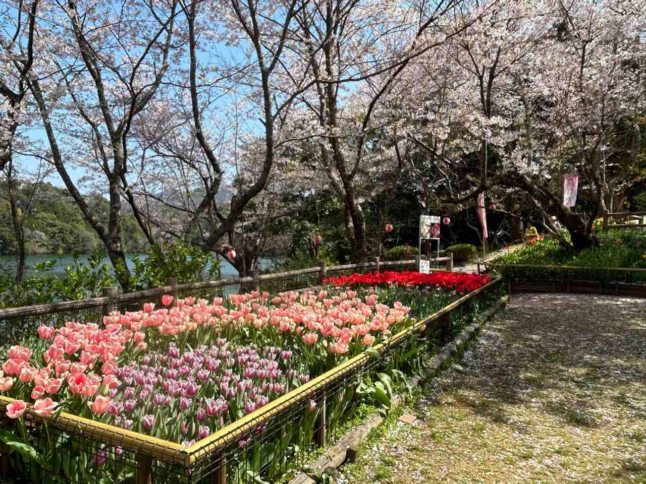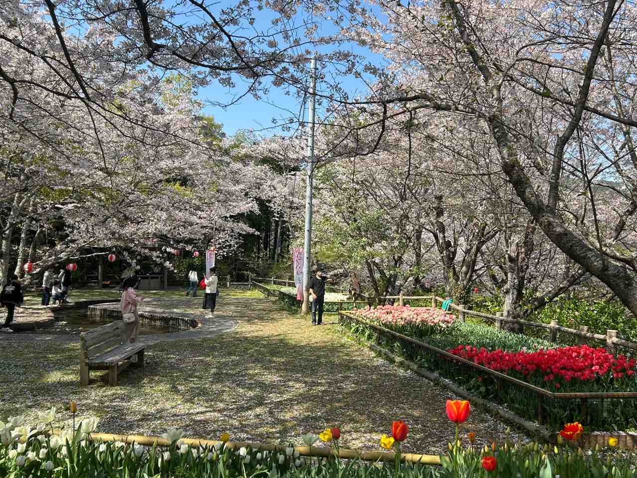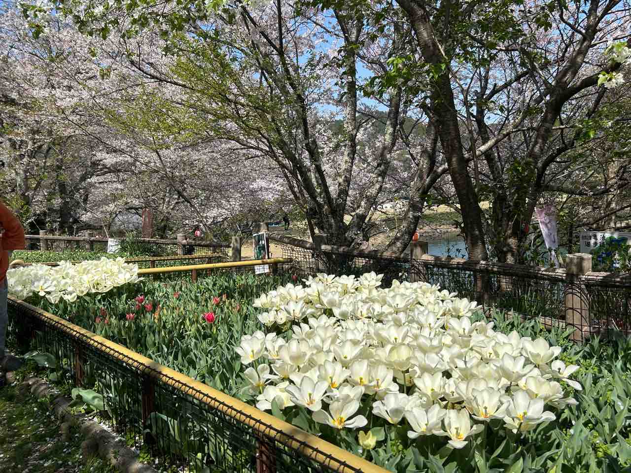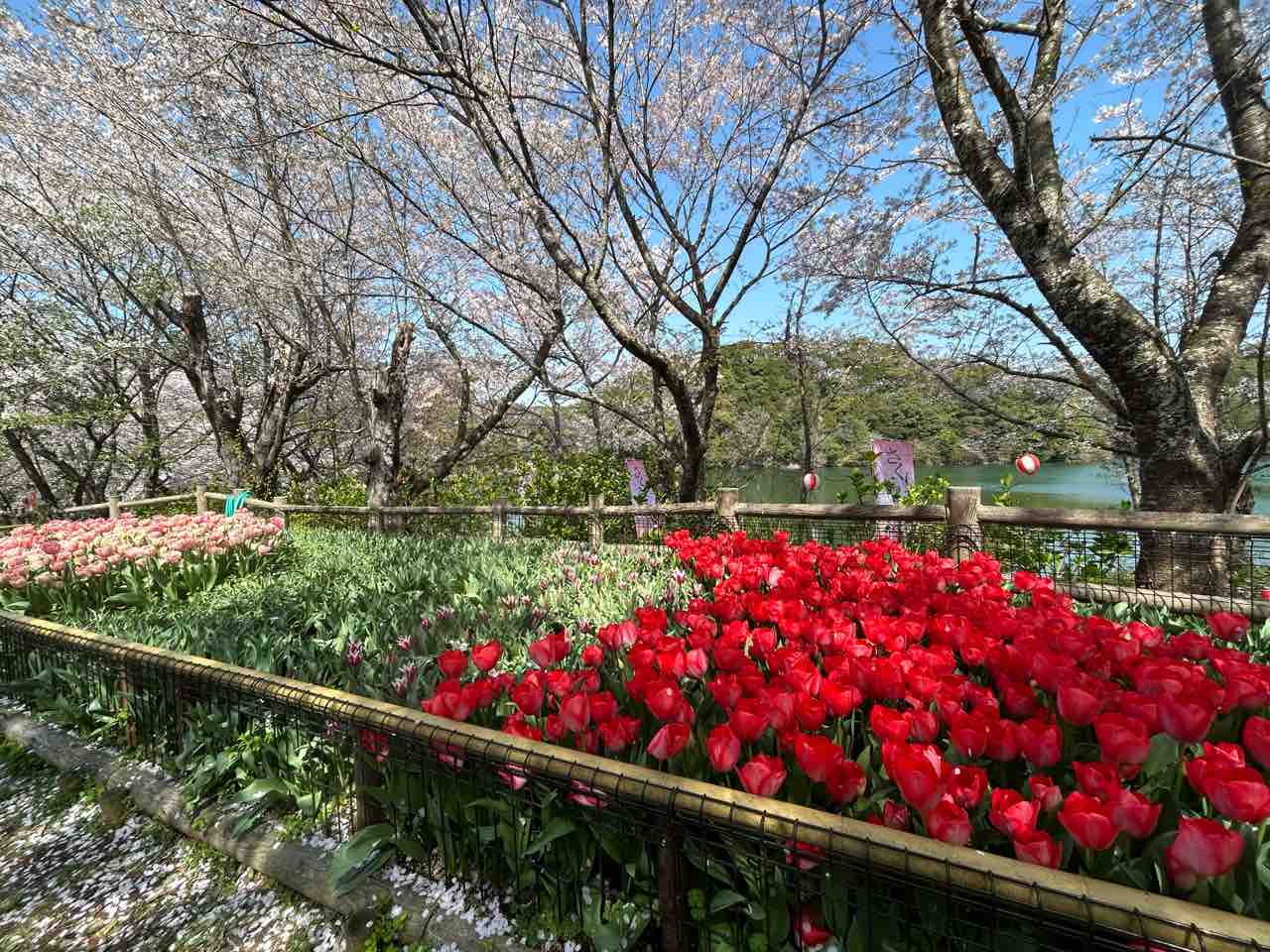 チューリップがギュギュッと詰め込まれている花壇と桜のコラボ🌷🌸