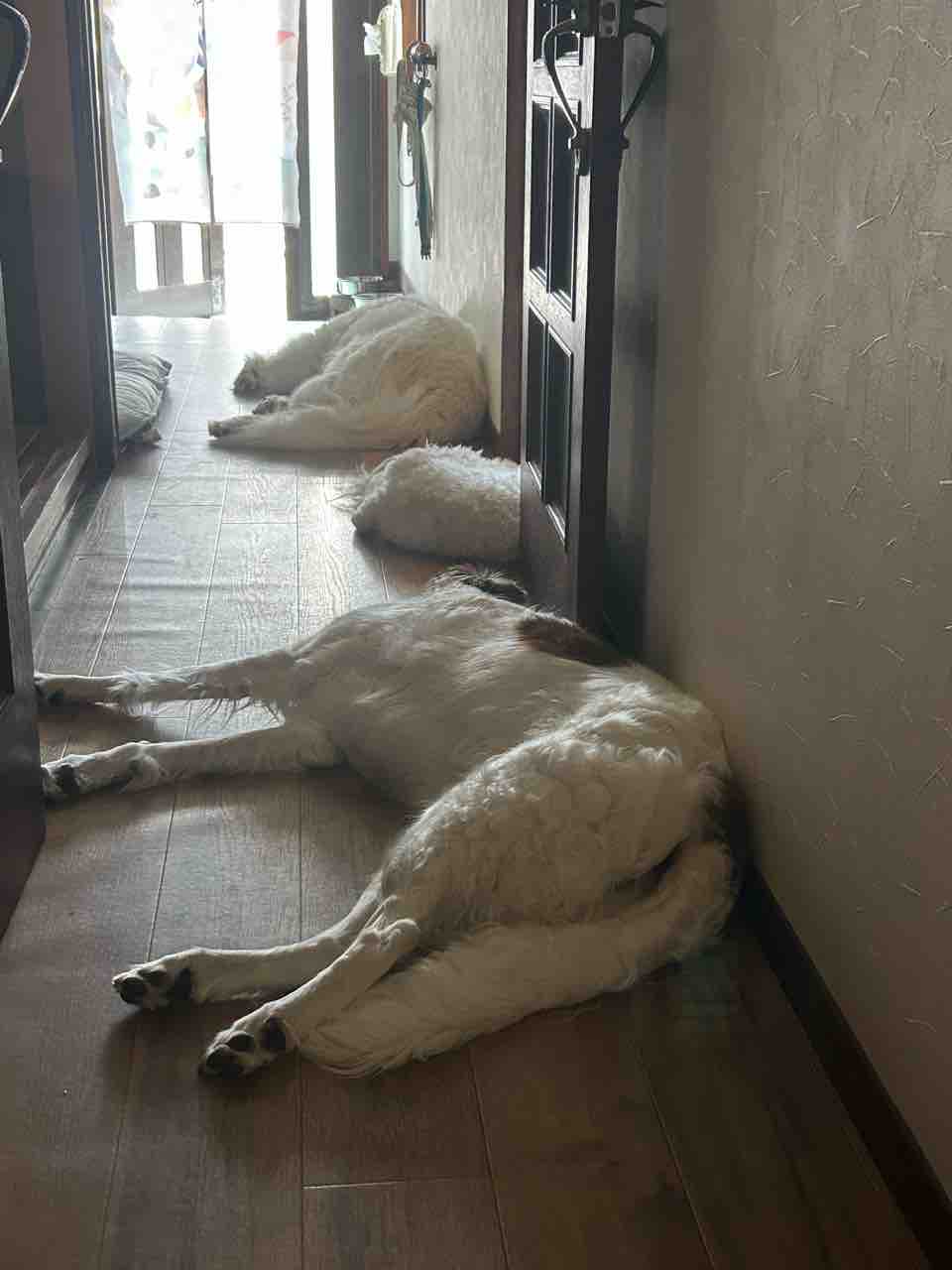 廊下、大人気🐶 2025年04月24日 昼から晴れましたー☀️そして、気温グングン上昇して⤴️風が通り抜ける玄関からの長い廊下が大人気❣️上から サマンサ・ももち・ミシェルミシェルの下半身…競走馬みたい(*゚▽゚*)💦ふっくらしたモモ筋と長いシッポがそう思わすのかな?真ん中のももち…どうなってるの?でしょ❗️こうなってるんです🎵廊下からリビングへ体またいで寝ている状態。寒い冬から一気に夏到来☀️いつ、エアコンスイッチオンになるか…年々早くなってる事は間違いないですね⤵️💧 < 前の記事次の記事 >