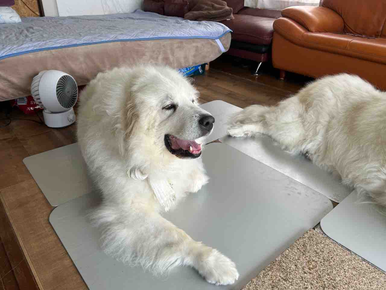 軽快に歩けた朝んぽ🐾サマンサご機嫌です💓 2025年07月08日 今朝の朝ンポ🐾 本調子にはなかなか回復しないサマンサの前足ですが、少しずつ少しずつ痛みがなくなりつつあるみたいで、今日はいつもの距離をゆっくり歩いて難なく帰ってこれました。暑過ぎて犬部屋へ入ってゆく早さときたら(笑)いい笑顔です(#^.^#)足が痛かったらこの笑顔は出ないでしょう🎵 しっかり歩けてよかったねぇ、サマンサ❣️隣でジニー、クールボードで足裏からアゴ、お腹全部冷やしております🧊あ、起き上がった💨