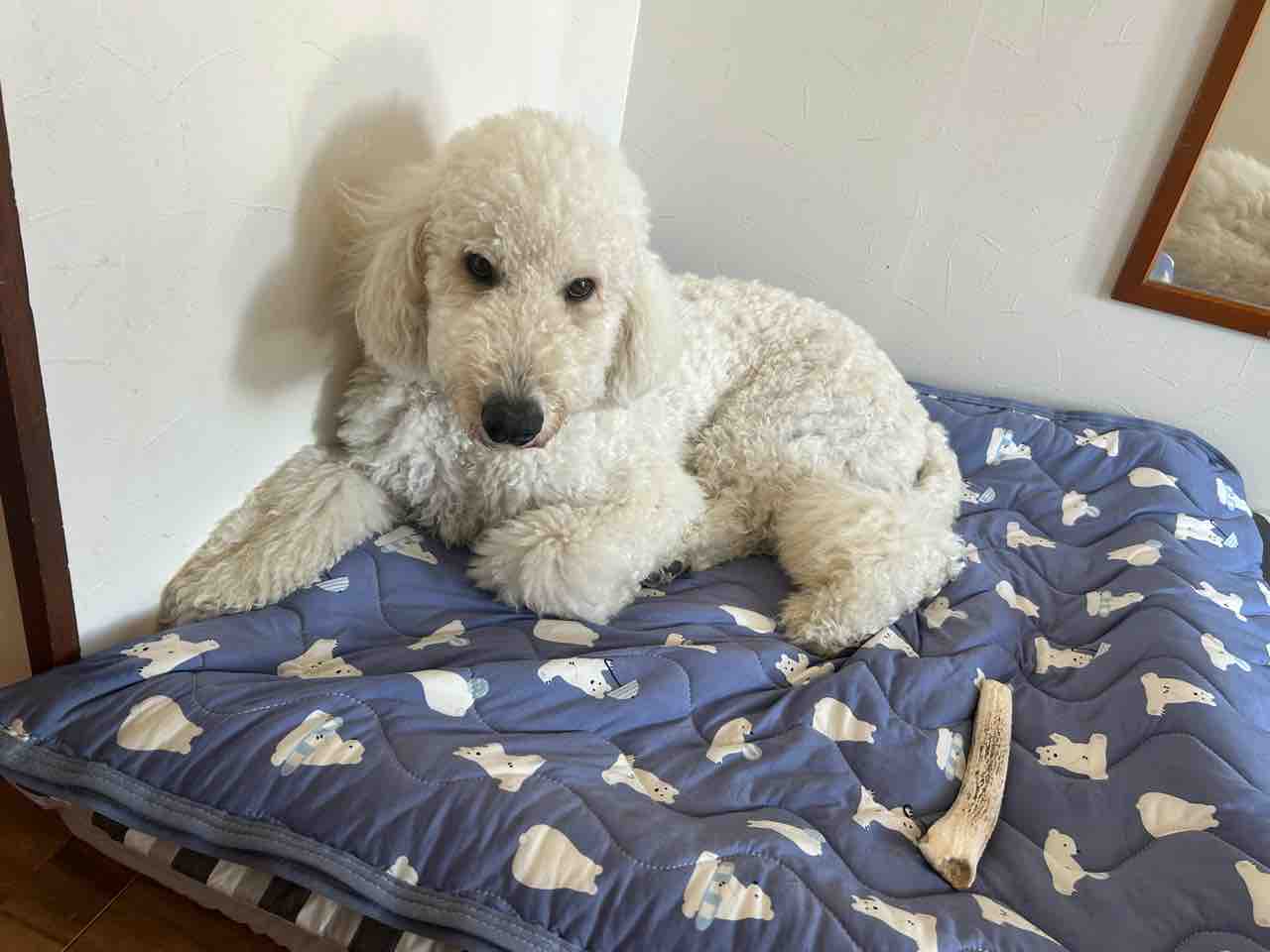 母ちゃんもここで寝まつか❓ちょっと狭いでつけど💧ありがと、ももち🍑