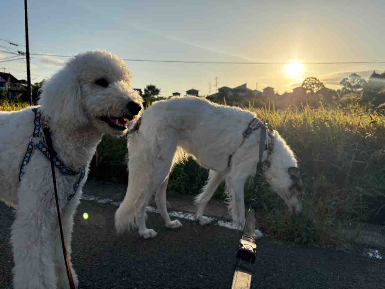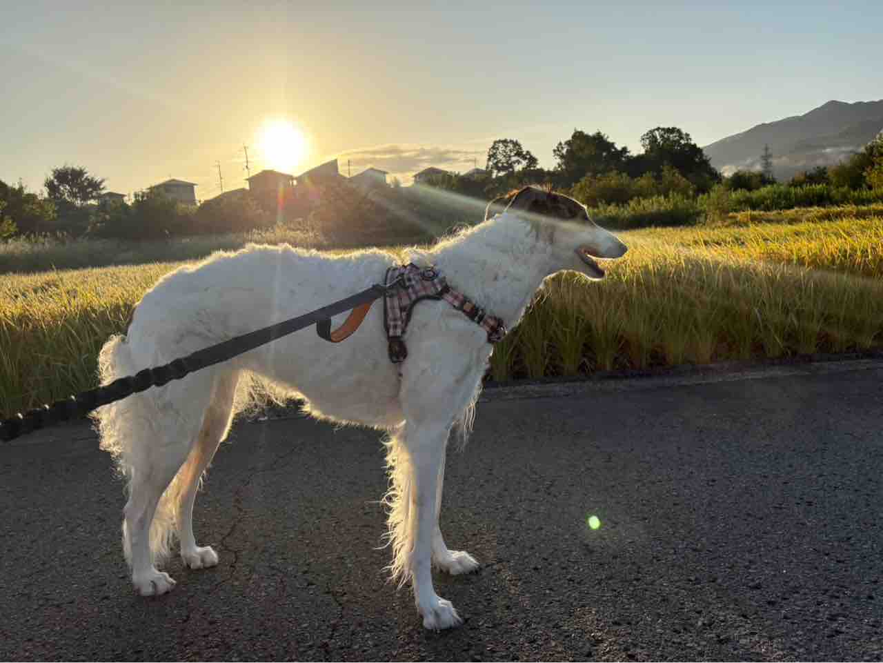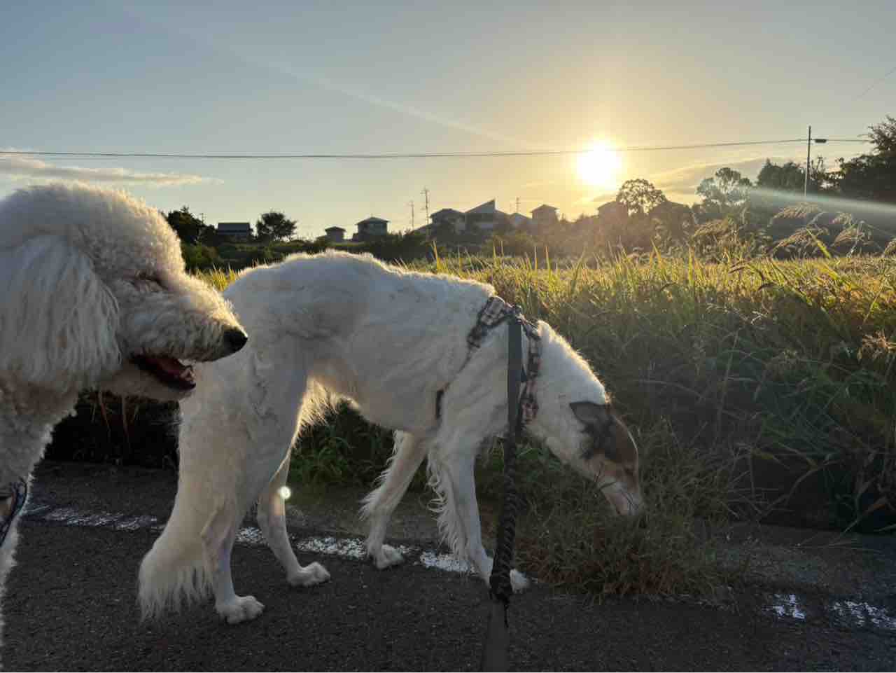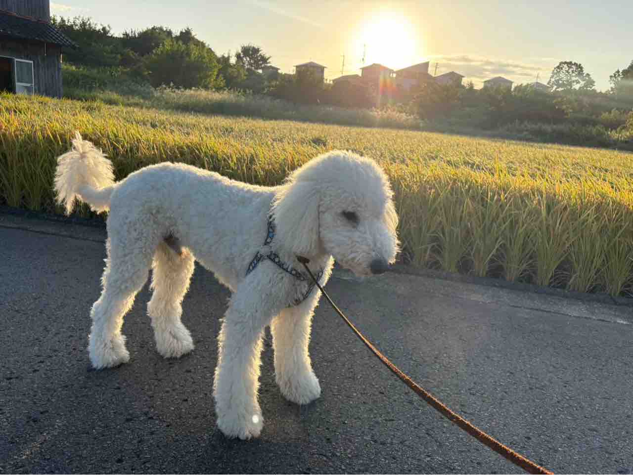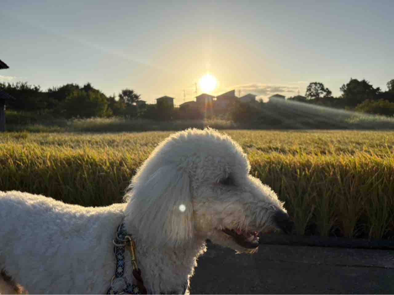 父さんの朝んぽミシェル&ももち🍑 2025年09月30日 午前7時日が登ってくる時間がかなり遅くなってきました。真夏に午前7時はもう出れない暑さだったから…季節は進んでますね〜🍂朝日に照らされるミシェルとももち🍑空気が冷たくて、涼しくて気持ちいい朝です✨今日は日中もエアコンいらずかも❓朝日に照らされ稲穂が更に黄金色🌾ももち…どーしたん❓歩き過ぎて…お腹空きまちた💧 (ももち)