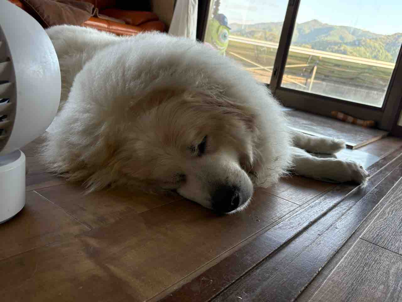 サマンサ、扇風機の風受け気持ち良さそうです☘️