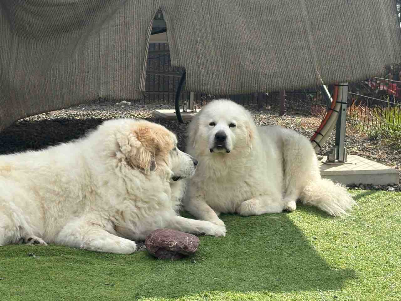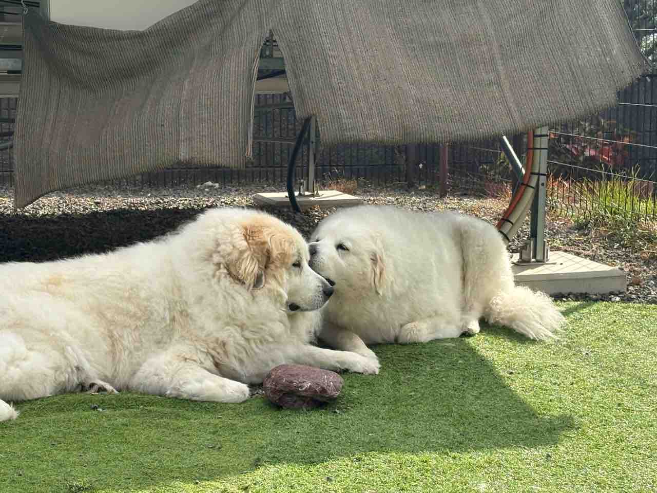 サマンサとジニーひそひそ話🌀 2025年11月29日 ポカポカ陽気の昼下がり☀️坂道が見える、中庭の日陰でサマジニがくつろいでいますジニーがサマンサに何か話ししてる…サマ姉ちゃん!母さん、私達ふたりを残してどこかお出かけするみたいでちゅよ💧そうなの〰️〰️〰️〰️🌀 (サマンサ)最近お出かけ多いけど〜私達ピレニーズ姉妹(特にサマンサ)はずーっと留守番だわ💧 (サマンサ)ふたりの顔 (≧∀≦)💦いつも、ももちはついて行くのね〰️良く動くからかしら〰️〰️🌀 (サマンサ)平等じゃないのは不公平でちゅ💢 (ジニー)ちょっと、母さんに文句言ってきまちゅ❗️母さん…ジニたんも〜お出かけしたいですっ‼️