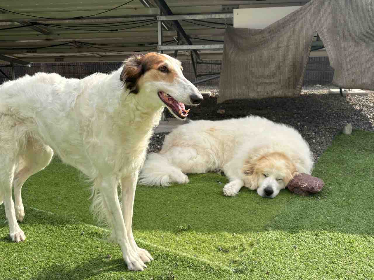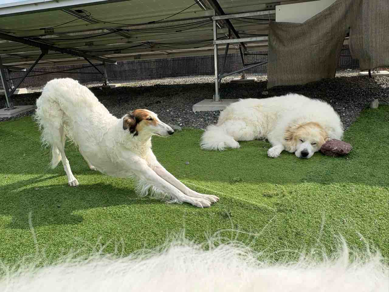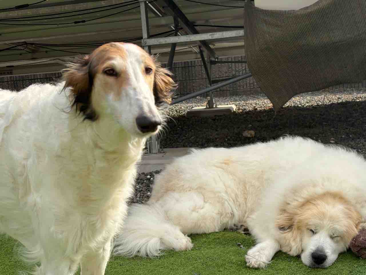 みんな中庭でまったり〜💕 2025年11月30日 こんなポカポカ陽気のお天気良い日は〜お家の中にいるよりお外で爽やかな風感じながらま〜ったりするの、最高だね☀️リタさん、ミシェルも出てきて日向ぼっこももち🍑母ちゃん!お天気良いし、どっかいこ💨 (ももち)そうだね〜一度、ミシェルをボルゾイ走りさせてみたいから〜河川敷へ連れて行ってみようかな?クーーーッ💨 (ミシェル)