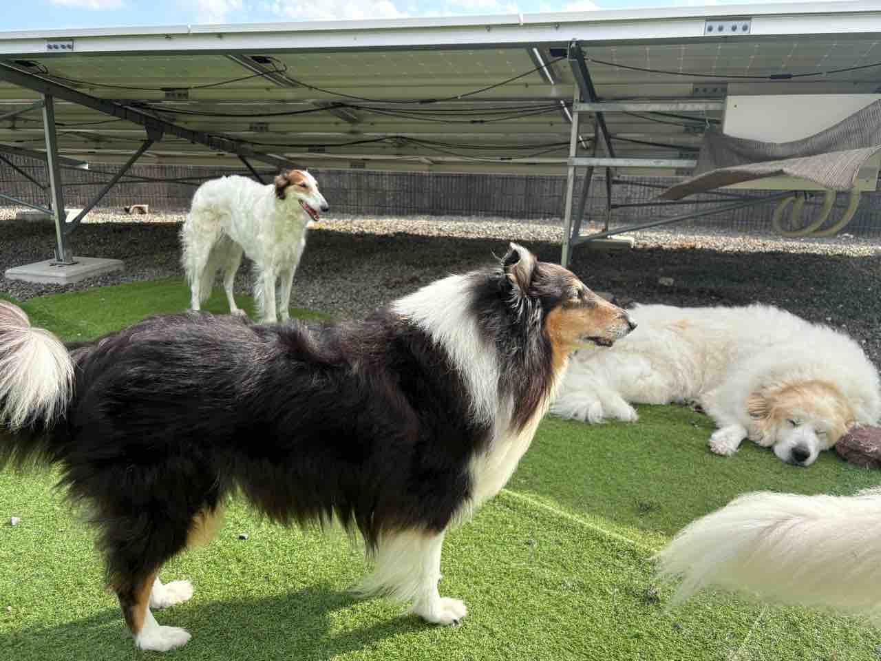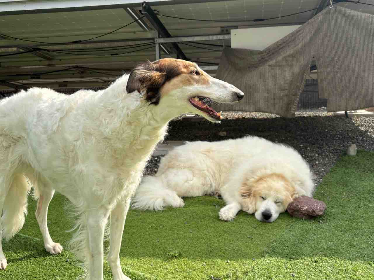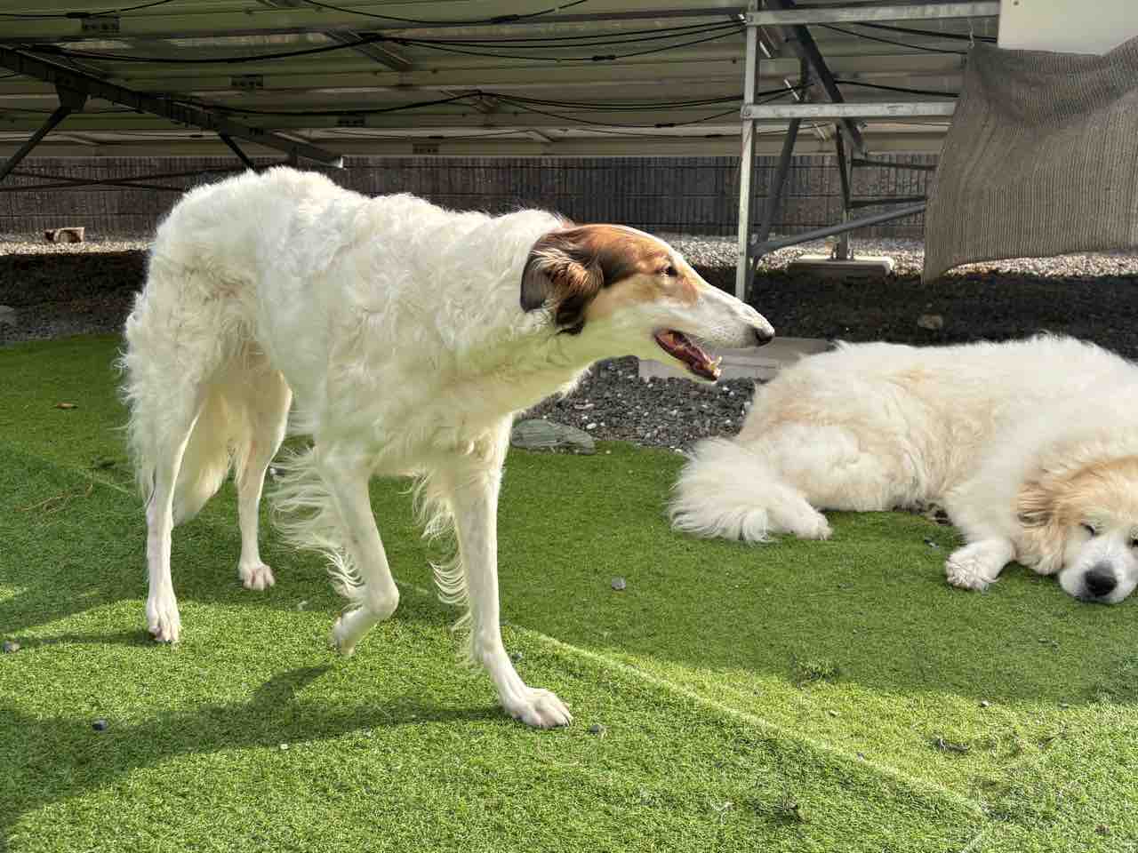 みんな中庭でまったり〜💕 2025年11月30日 こんなポカポカ陽気のお天気良い日は〜お家の中にいるよりお外で爽やかな風感じながらま〜ったりするの、最高だね☀️リタさん、ミシェルも出てきて日向ぼっこももち🍑母ちゃん!お天気良いし、どっかいこ💨 (ももち)そうだね〜一度、ミシェルをボルゾイ走りさせてみたいから〜河川敷へ連れて行ってみようかな?クーーーッ💨 (ミシェル)