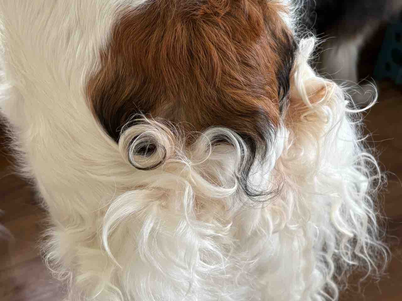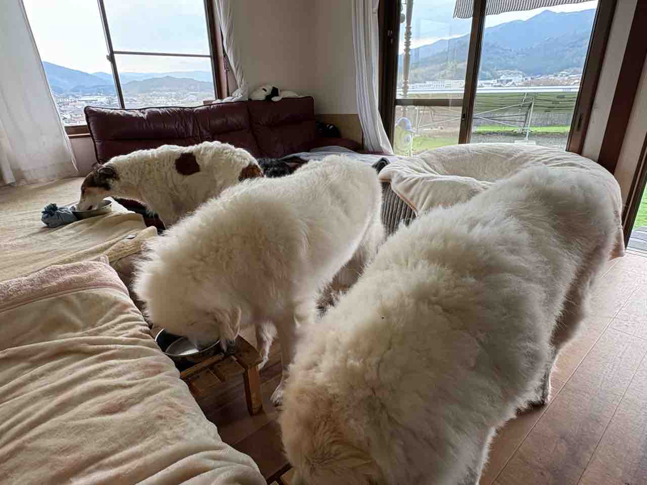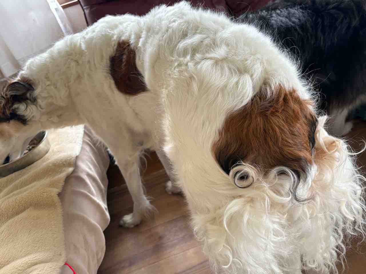 ミシェルの飾り毛🌀 2026年01月05日 朝ンポ終わり、朝ごはんタイム🍚みんな与えられたポジションで賢く、お行儀よく食べてます🎶ふと、ミシェルを観察すると…お尻の飾り毛がかなりウェービー➰➰➰ほらほら❗️ウェーブ通り越して巻き切ってる🌀ボルゾイなのに、なぜか短毛ミシェルだけど…お尻の飾り毛だけはボリューミー💨頼むから〜去年の今頃みたいに脱毛しないでよ〰️ミシェルさん (^◇^;)💦 < 前の記事次の記事 >